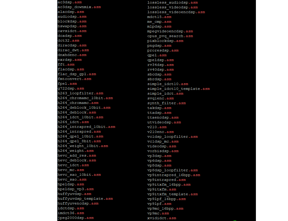I am currently comparing files between x86_64 version of ffmpeg and the Aarch64. While some files may be optimized in Aarch64, it only had 49 files compared to the 522 file in the x86 directory. This may indicate that there were more optimization files in the x86_64 platform. Below are images of files with the extension asm. These files are used to compile assembly language code in the x86_64 platform.